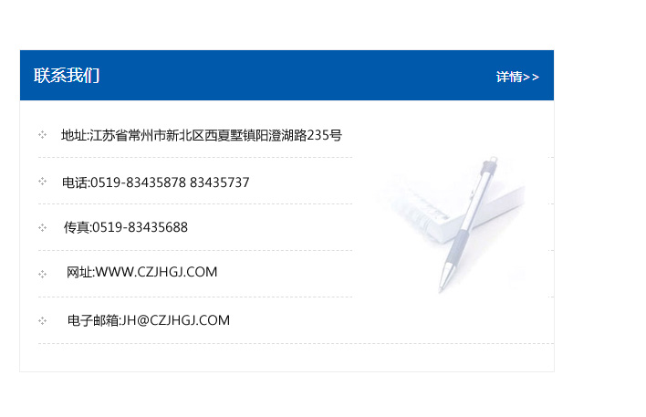 地址:常州市新北區友邦商務大廈1幢16、17層  電話:0519-85101652  傳真:0519-85112595  郵編:213022  網址:www_cz-jiayue_cn.mtyx88.com  郵箱:xiajifengaa@163.com